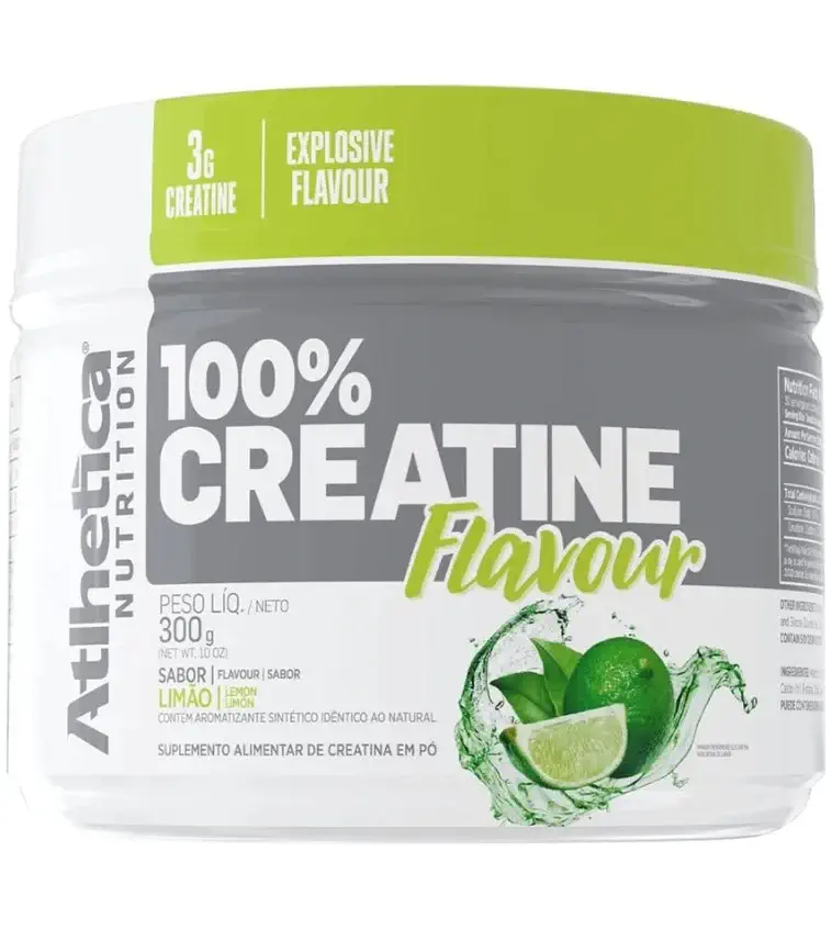 - Atlhetica Nutrition 100% Creatine Flavour sabor limão 300g: contém maltodextrina e sódio na composição. Deve ser tomada em uma dose diária de 10 gramas ou 2 dosadores cheios. Essa quantidade fornece 2,8g de creatina;
