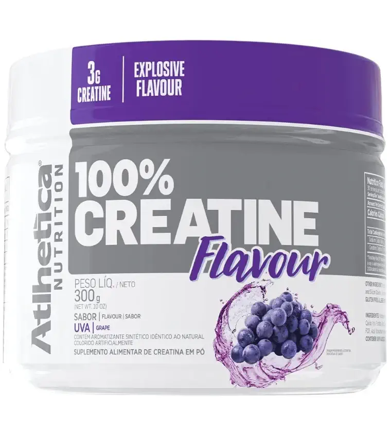 - Atlhetica Nutrition 100% Creatine Flavour sabor uva 300g: apresenta a mesma composição e instruções de dosagem da versão limão. A única diferença está no sabor.